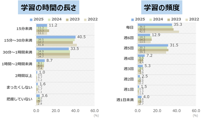家庭学習の時間の長さについて聞きました。最も多かったのは、「15分~30分未満」で40.5%でした。次に「30分~1時間未満」が33.5%と続きます。家庭学習の頻度については「毎日」が35.3%と最も多く、「週5日」が31.5%と続きます。「毎日」は減少傾向にあることがわかりました。