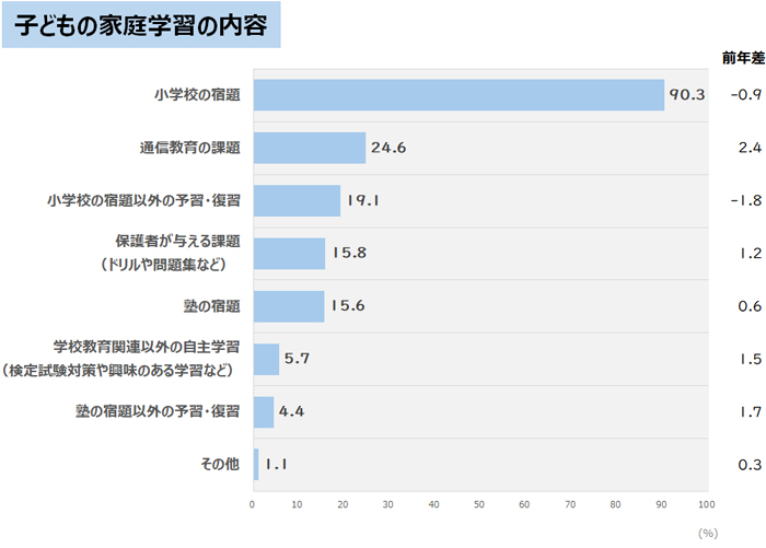 子どもの家庭学習の内容(複数回答可)を聞きました。「小学校の宿題」は昨年に比べて0.9ポイント減少、「小学校の宿題以外の予習・復習」も昨年に比べて1.8ポイント減少しています。一方で、「通信教育の課題」は24.6%と、昨年に比べ2.4ポイント増加する結果となりました。