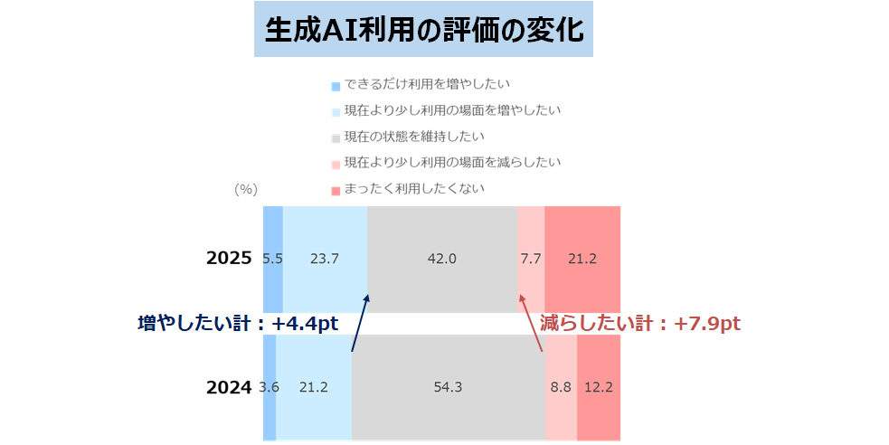 家庭学習における生成AIの利用についての評価を聞いたところ、「できるだけ利用を増やしたい」が5.5%、「現在より少し利用の場面を増やしたい」が23.7%と、合わせて29.2%となり、昨年より4.4ポイント増加する結果となりました。「まったく利用したくない」は21.2%、「現在より少し利用の場面を減らしたい」は7.7%と、合わせて28.9%となり、昨年より7.9ポイント増加する結果となりました。